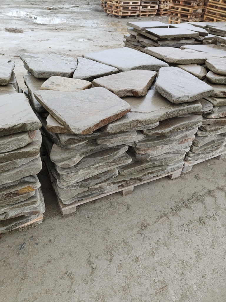 Галтованный серо-зелёный песчаник для мощения дорожек, пешеходных зон, тротуаров на землю, грунт, песчано-щебёночную подушку.